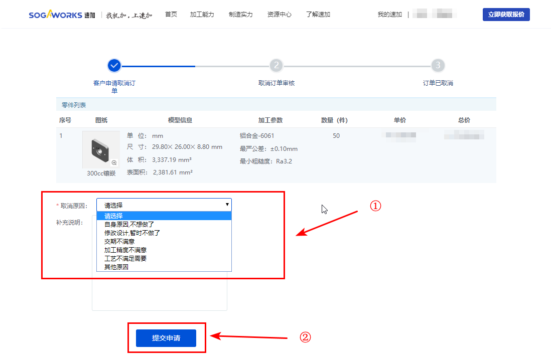 6. 按提示完善信息后,點擊【提交申請】,訂單取消申請成功