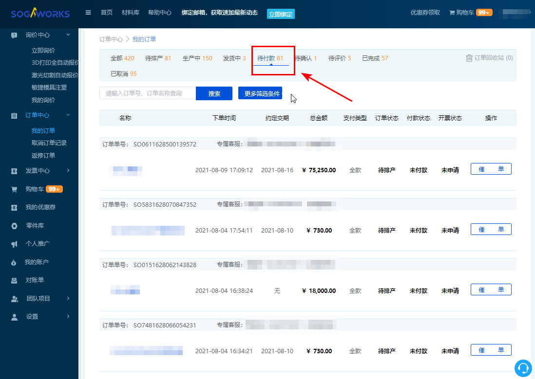 3. 點擊【待付款】,進入代付款訂單列表